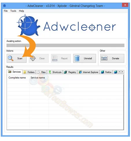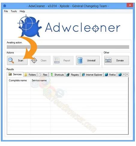 Download dan instal software AdwCleaner dari sini : Download, setelah di download, lalu jalankan, pilih "SCAN" :